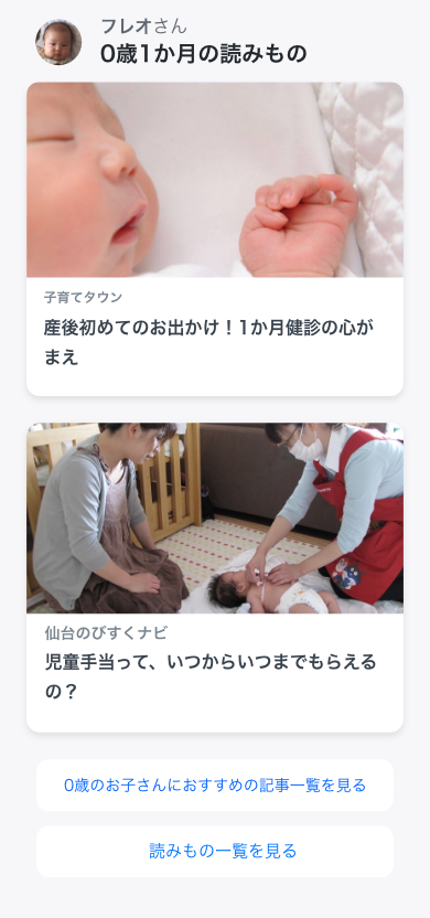 子育てタウンアプリの「パーソナライズ機能」は、ユーザーが登録したお子さんの年齢情報に合わせて、今利用できる行政サービスや、直近で参加できるイベントなどの情報、子育てに関する読みものなどを表示する機能です。
