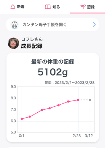 ユーザーが登録した身長・体重・頭囲・胸囲の情報をもとに、成長のようすをグラフで表示します。