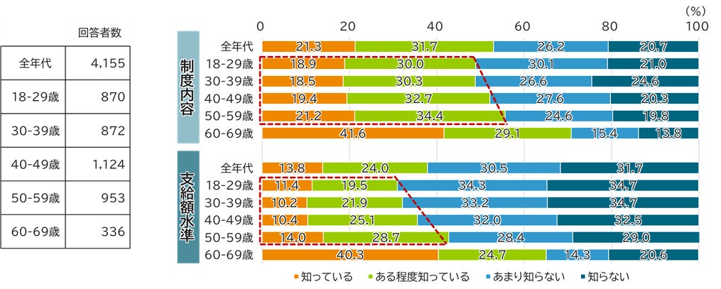 勤め先の退職金・企業年金について、18歳~39歳の約半数が「制度」としては知っており認知度は高い。一方で、退職金・企業年金の「支給水準」のイメージは、40歳代までは3割程度、50歳代でも4割程度と高くない状況