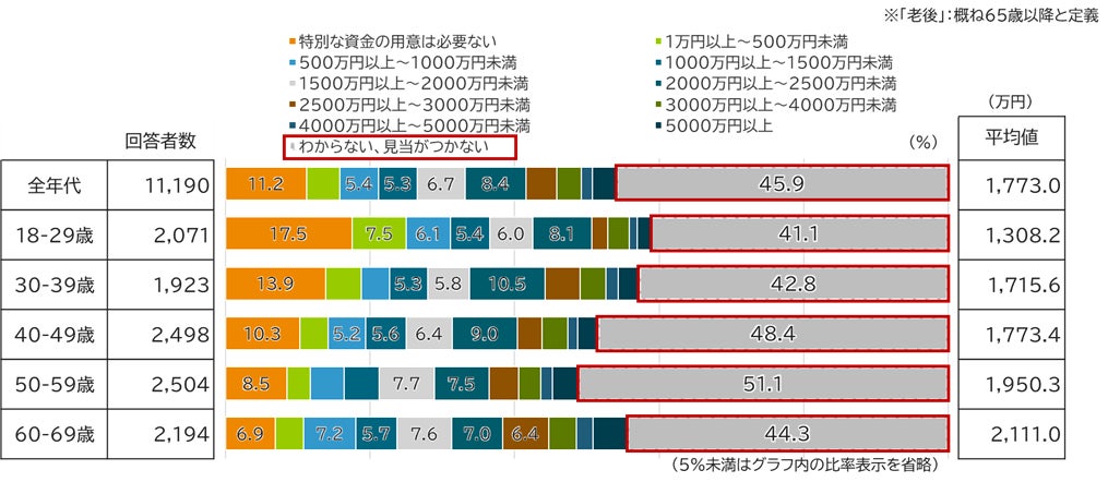自分の老後資金について、回答者の4割~5割が「金額の想像がつかない」と回答