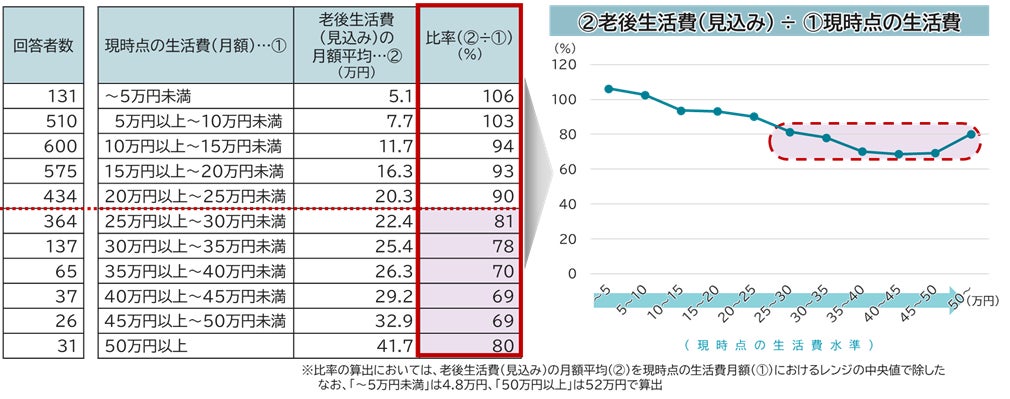 なお今回、50歳代・60歳代に「現時点の生活費」と「老後生活費(見込み)」をたずねています【図表5】。現時点の生活費が一定以上の区分においては、老後生活費の見込みを現時点の生活費のおおよそ7-8割程度と想定していることが確認できました。リタイア後の生活費について「現時点の生活費から極端に減らさなければ」という意識ではないようです。