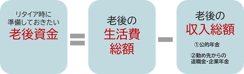 ミライ研では、「(リタイア時に準備しておきたい)老後資金」は「老後の生活費総額」と「老後の収入総額」の差額【図表2】と想定し、各項目についての意識を調査しました。