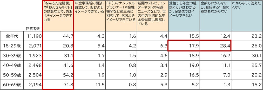 老後の収入については、柱である「公的年金」に関して「ねんきん定期便」などで受給月額をイメージしている人が全体の45%を占めた。一方、若年層においては「種類はわかるが、金額はわからない」が約2割、「種類も金額もわからない」が約3割との結果となった