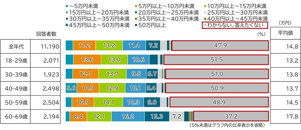 また、老後の生活費に関してたずねたところ、回答者の約半分(47.9%)が「イメージ出来ていない(わからない・答えたくない)」と回答しています【図表4】。リタイアへの意識が高まってくる50歳代でも「わからない・答えたくない」比率が5割程度あり、年齢が高くなっても「イメージ出来ていない」比率が減少していない点が特徴といえます。