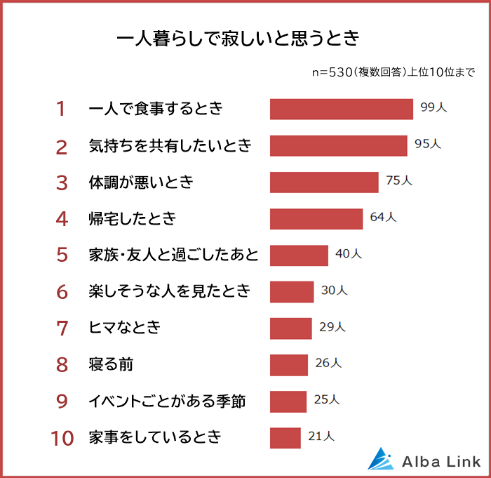 今回、株式会社AlbaLink( https://albalink.co.jp/ )が運営する訳あり物件買取ナビ( https://albalink.co.jp/realestate/ )は、一人暮らしの男女530人を対象に「一人暮らしで寂しいと思うこと」についてアンケート調査を実施しました。