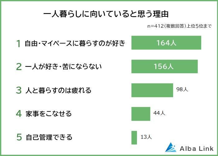 一人暮らしに向いていると思う理由1位は「自由・マイペースに暮らすのが好き」