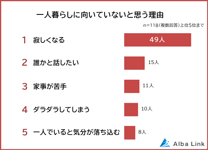 次に「一人が暮らしが向いていない」と回答した118人に理由を聞いてみました。