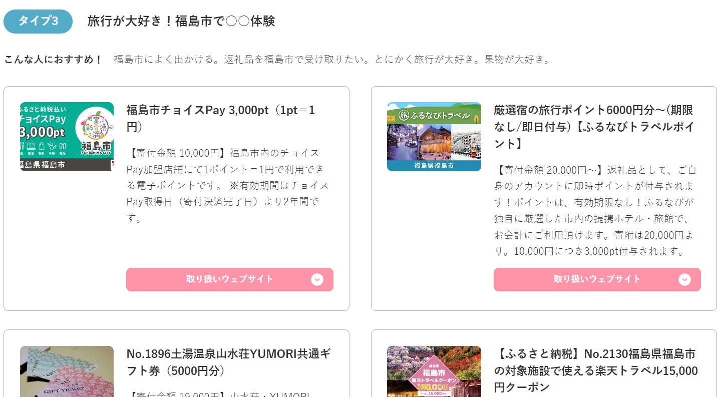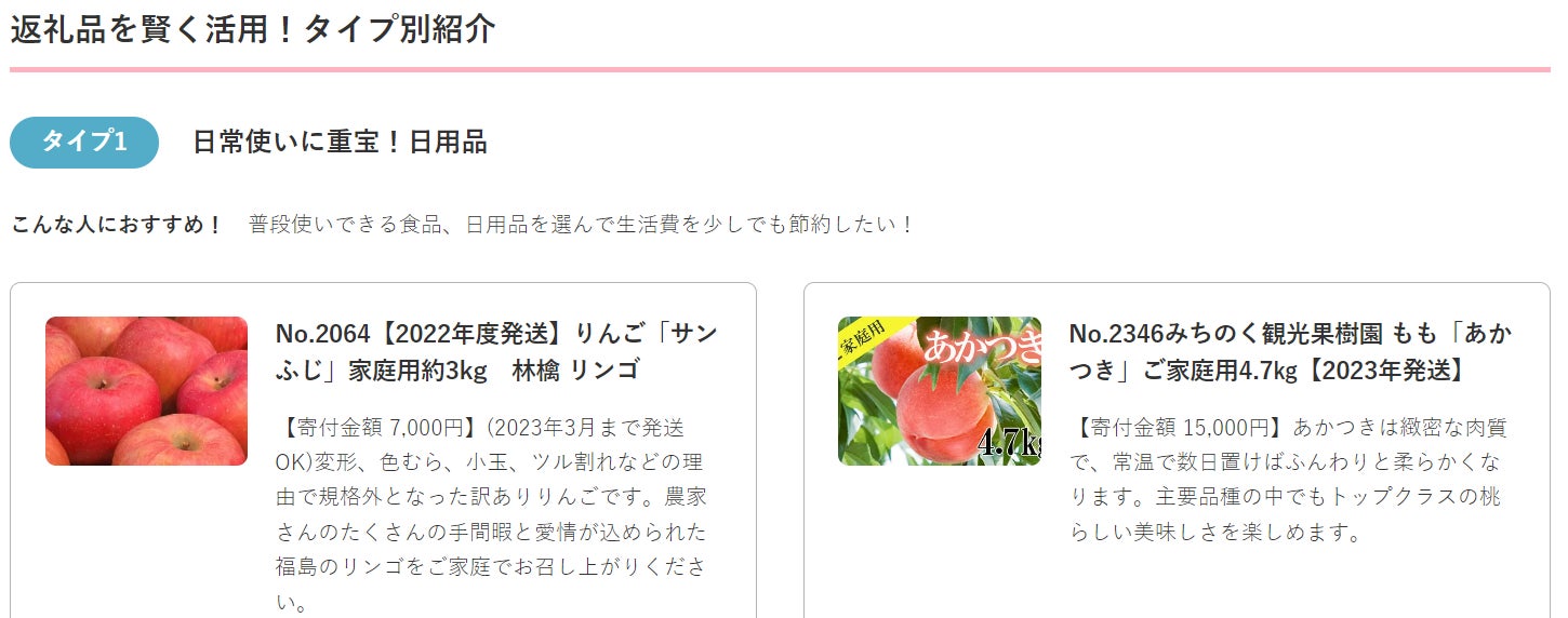 この12月に連続リリースした新返礼品をはじめ、福島市の人気定番返礼品の「フルーツ定期便」や「もも」「さくらんぼ」「梨」「りんご」等々をまとめて紹介しながら、「生活便利品」「プチ贅沢」「旅行」等のタイプ別に紹介した構成となっています。