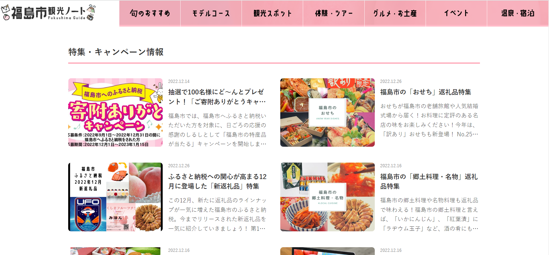 この度福島市観光コンベンション協会が運営するオウンドメディア「福島市観光ノート」内のふるさと納税特集紹介ページが大幅リニューアル公開をしましたので、お知らせします。