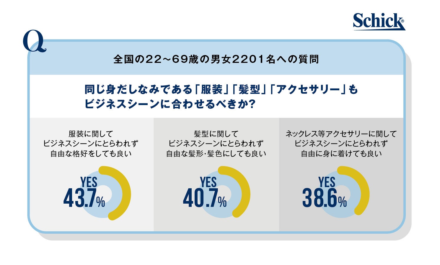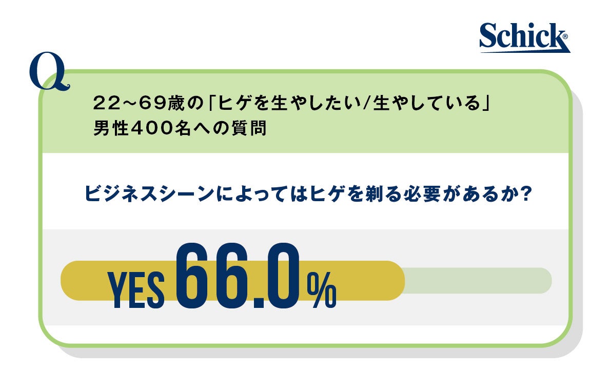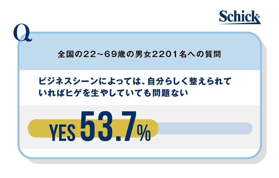 そこで、シックでは「ビジネスシーンの『ヒゲ』に関するアンケート調査」を実施しました。全国22歳から69歳の「ヒゲを生やしたい/生やしている」男性400人を対象にした「ビジネスシーンによっては、ヒゲを剃る必要があるか?」という質問に対して、66%の人が「ある」と回答。しかし、全国22歳から69歳の男女2201人を対象にしたアンケートの結果では、53%の人が「ビジネスシーンによっては、自分らしく整えられていればヒゲを生やしても問題ない」と回答しています。この結果から、ビジネスシーンで多くの人がヒゲを剃っている一方で、受け手側は必ずしも「剃る必要はない」と感じている人も多く、明確なヒゲ禁止規定が定められていないにも関わらず、「なんとなく」ヒゲを剃っている人が多数いるという現状が浮き彫りになってきました。