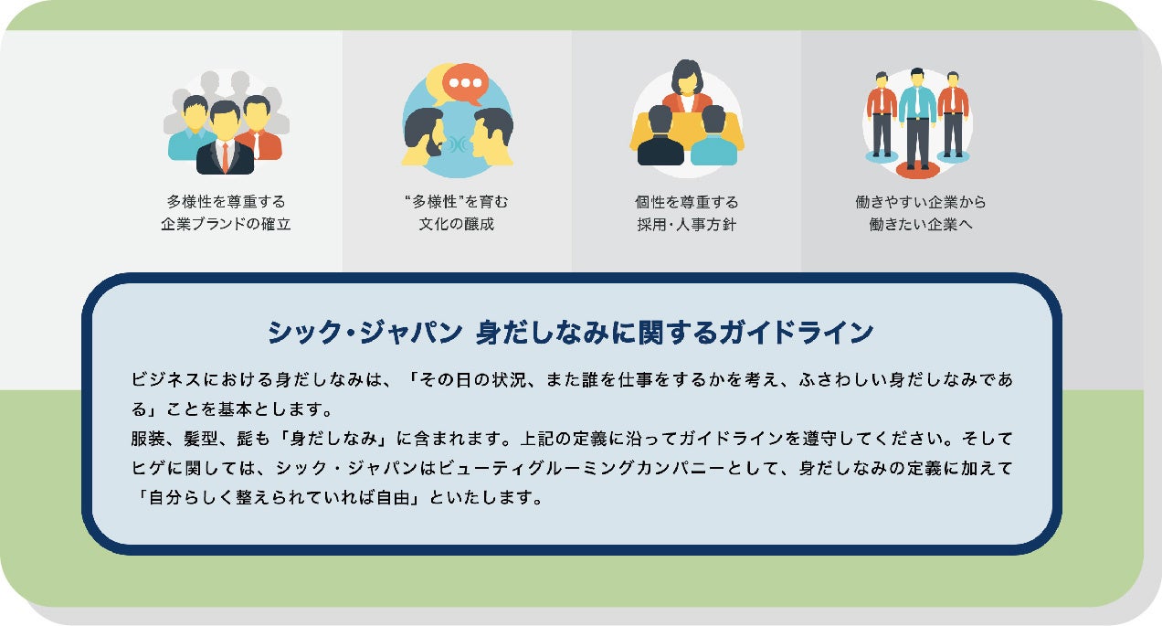 その取り組みの一環として、シックは身だしなみに関する自社のガイドラインを、2023年4月よりアップデート。就業時のヒゲに関する項目には、「自分らしく整えられていれば自由」と明記され、自社の社員に対しても、ヒゲをより自由に楽しめる環境作りを進めています。