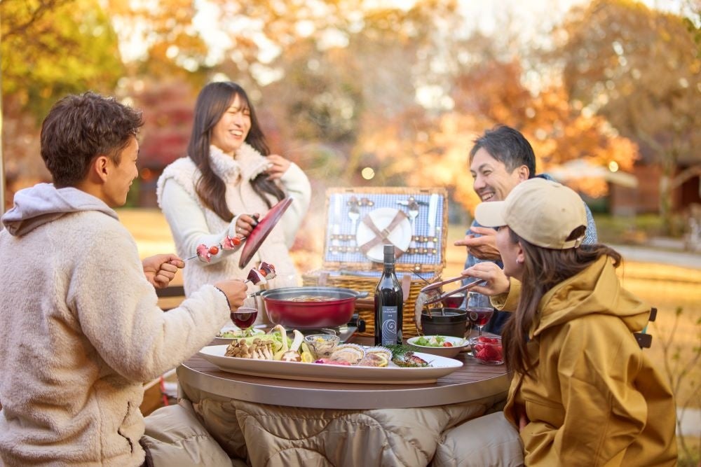 「グランヴォー スパ ヴィレッジ」での宿泊は、自然に囲まれた上質な宿泊体験ができる「テントキャビン」「テントキャビンプレミアム」、アウトドアリビングとアウトドアダイニングで森の四季を満喫できる「テラスハウス」からお選び頂けます。ご宿泊の方のみご利用可能な露天風呂付き天然温泉「紅葉乃湯」がご利用可能なほか、併設する「BARもみじ」にてオリジナルのハーブカクテルを1杯プレゼントします。お食事は、1月~2月はプライベートテラスのコタツで味わう房総鍋(ジビエもしくは海鮮)、3月はBBQプランをご用意しています。