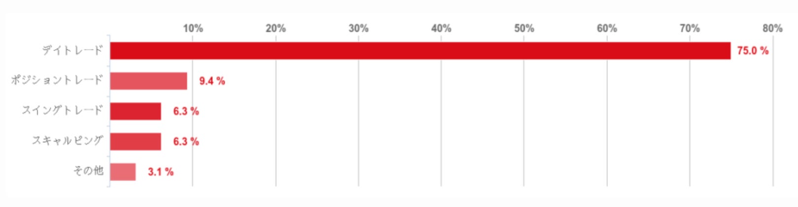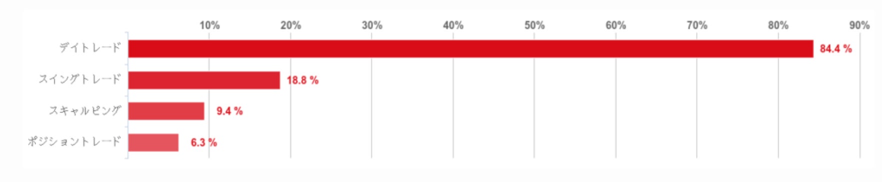 アンケートによれば、主婦たちが採用しているスタイルは多様であるが、特にデイトレードが主流であることがわかる。全体の84.4%がデイトレードを採用しており、次いでスイングトレードやスキャルピングがそれぞれ18.8%と9.4%を占めている。
