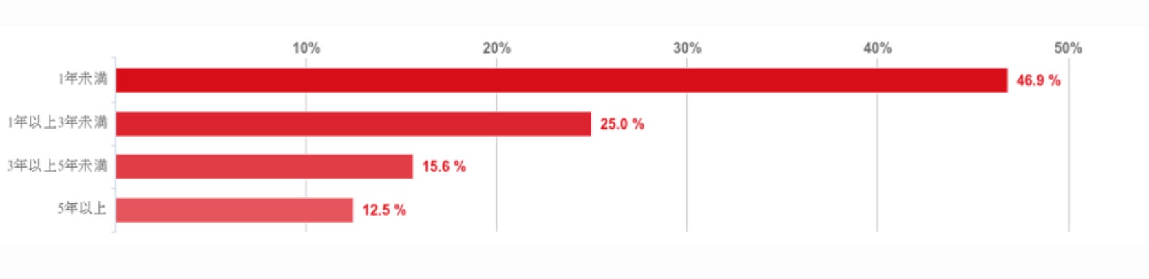 具体的には、1年未満の初心者から5年以上のベテランまで様々な経験者が存在する。全体の46.9%が1年未満の初心者であり、次いで25.0%が1年以上3年未満、15.6%が3年以上5年未満、そして12.5%が5年以上の経験を持つトレーダーである。