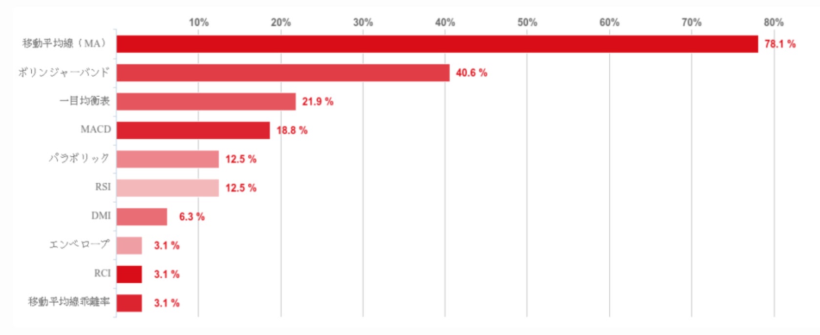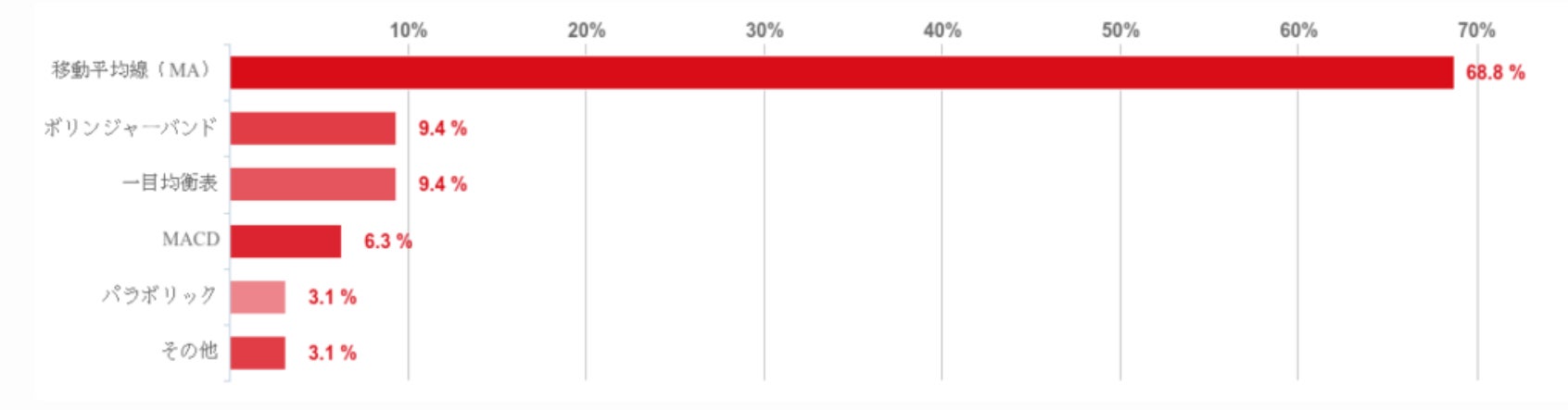 アンケートによれば、主婦たちが利用するテクニカル指標は多岐にわたるが、特に人気がある指標は移動平均線(MA)であり、全体の78.1%がこの指標を使用している。