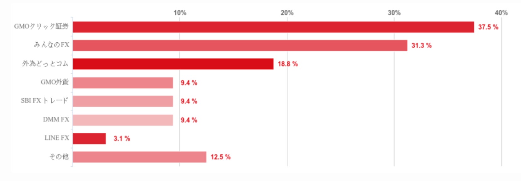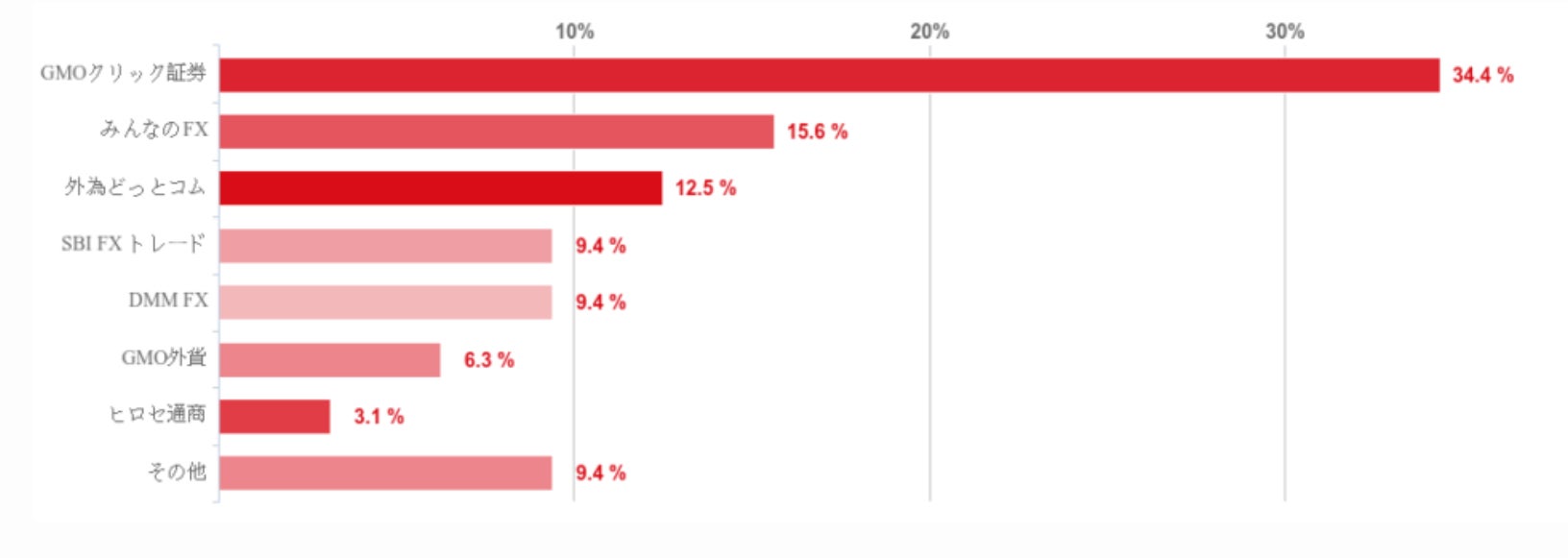 アンケートによれば、GMOクリック証券が34.4%と2位のみんなのFXの15.6%と比べて圧倒的支持を得ていることがわかる。