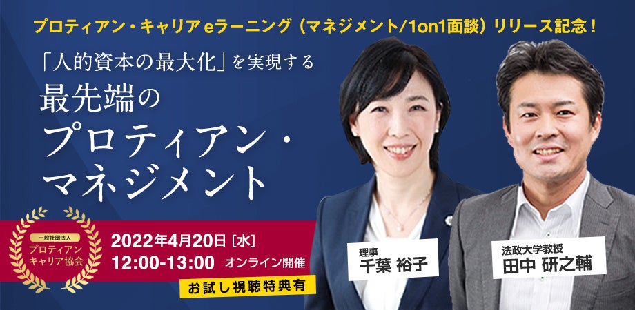 組織と個人のより良き関係性構築と個人の主体的なキャリア開発を支援する一般社団法人プロティアン・キャリア協会 (東京都新宿区、代表理事:田中研之輔・有山徹、以下、「当協会」)は、人的資本最大化に向けた支援として、国内初の管理職層に向けたプロティアン・キャリアeラーニングの「マネジメント編」及び「1on1面談編」を開発し、2020年5月より4designs株式会社を通じて販売を開始します。販売開始に伴い、4月20日(水)12時~13時にてリリース記念オンラインセミナーを実施いたします。URL:https://protean-management220420.peatix.com/