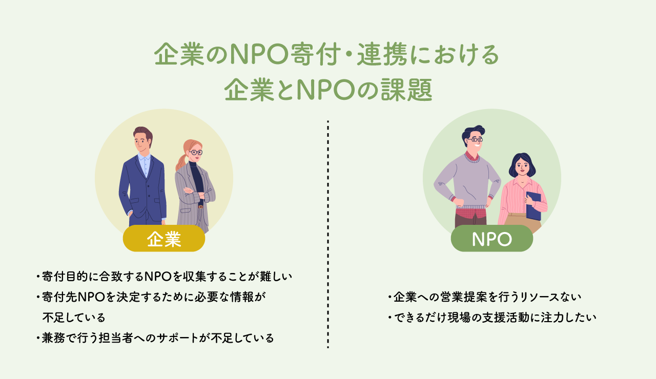 一方で、企業担当者からの「自社の本業に適した寄付先がわからない」「寄付先を兼務の担当者だけで選定するのは難しい」「サポートしてくれる専用サービスがほしい」といったいくつものニーズが浮き彫りになっている現状もあります。