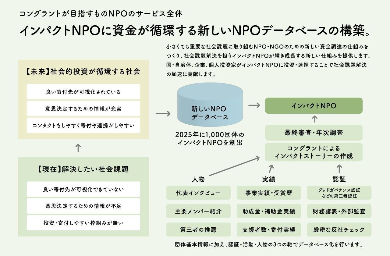 世の中には無数の社会問題があり、行政の支援が行き届かずに取り残された、立場の弱い人々が数多くいます。コングラントは、NPOなど社会的組織のファンドレイジングを支援するツールの提供を通じて、これらNPO等の持続的な活動を支援し、インクルーシブな社会の実現を目指しています。また、企業とNPOの連携促進に向けたNPOデータベースの提供を含め、企業・行政・NPOがそれぞれの枠を超えて協働しながら社会課題の解決を図るコレクティブインパクトのためのプラットフォームとなることを期待しています。