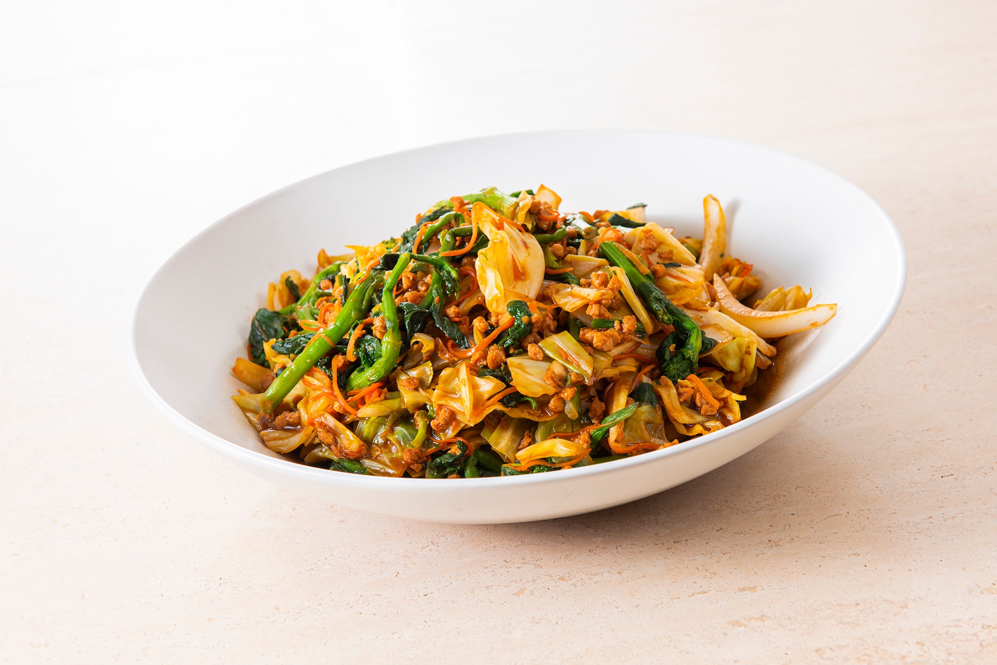 ゆず胡椒風味春キャベツと菜の花を使用し、ゆず胡椒をアクセントにした炒め物です。大豆ミートを使用し、たんぱく質が豊富でヘルシーな一品に仕上げました。