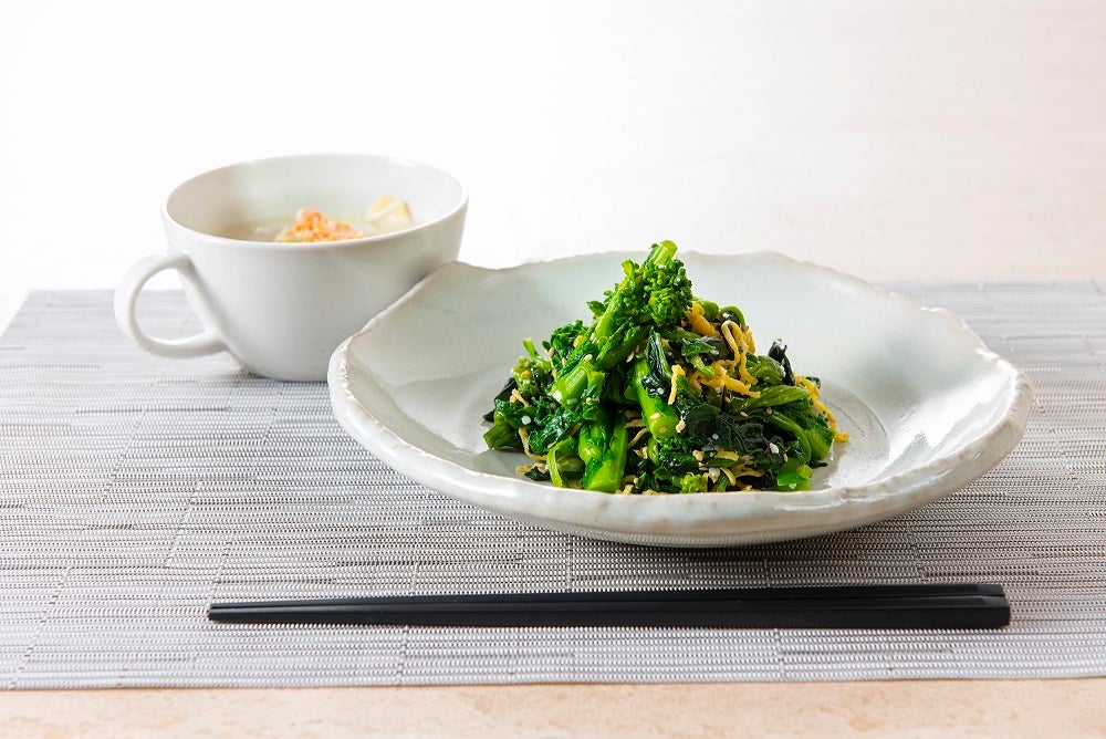 菜の花を使用した春らしい和え物です。美肌や免疫力UPにも期待ができる生塩糀を使用した健康的な一品です。