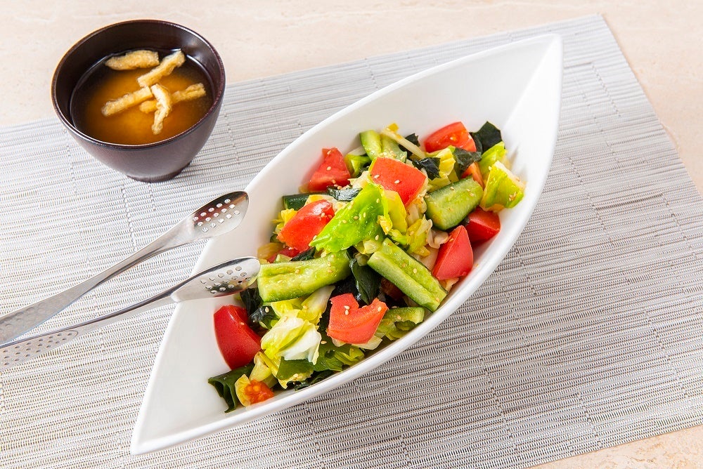 「春野菜と大豆ミートの味噌炒め ゆず胡椒風味」、「春キャベツのチョレギサラダ」、