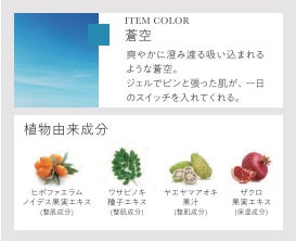 透明感のある薄いブルーが爽やかな、弾力感に優れた形状記憶タイプの美容液型保湿ジェル。肌にうるおいを与える天然保湿剤の「スイゼンジノリ細胞外多糖体(*1)」をはじめ、こだわりの自然由来成分を配合し、肌を健やかに保ち乾燥を防ぎます。伸びがよく肌にしっかりとなじみ、ベタつきを残しません。化粧下地としてもご使用いただけます。