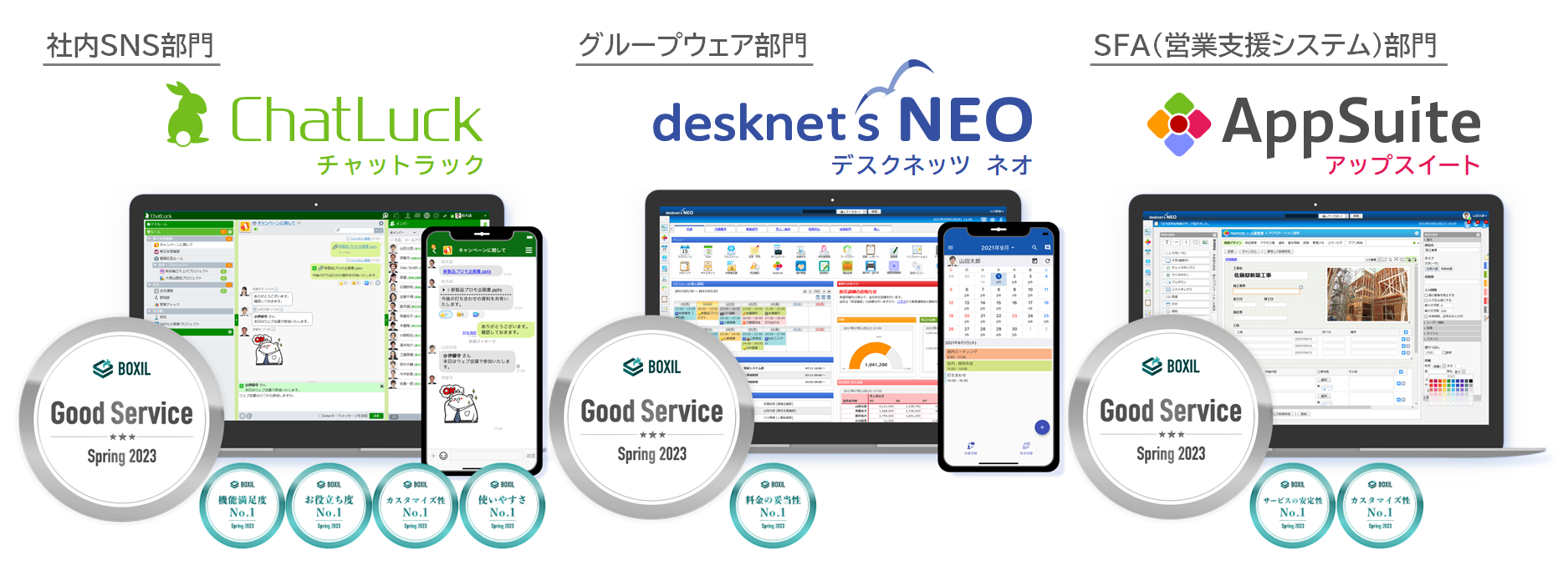 株式会社ネオジャパン(本社:神奈川県横浜市、代表取締役社長:齋藤 晶議)はスマートキャンプ株式会社(以下「スマートキャンプ」)が今最も評価されているSaaSを表彰する「BOXIL SaaS AWARD Spring 2023」において、グループウェア『desknet's NEO』、ビジネスチャット『ChatLuck』、ノーコードアプリ作成ツール『AppSuite』が、それぞれ3部門で10の賞を受賞したことをお知らせします。