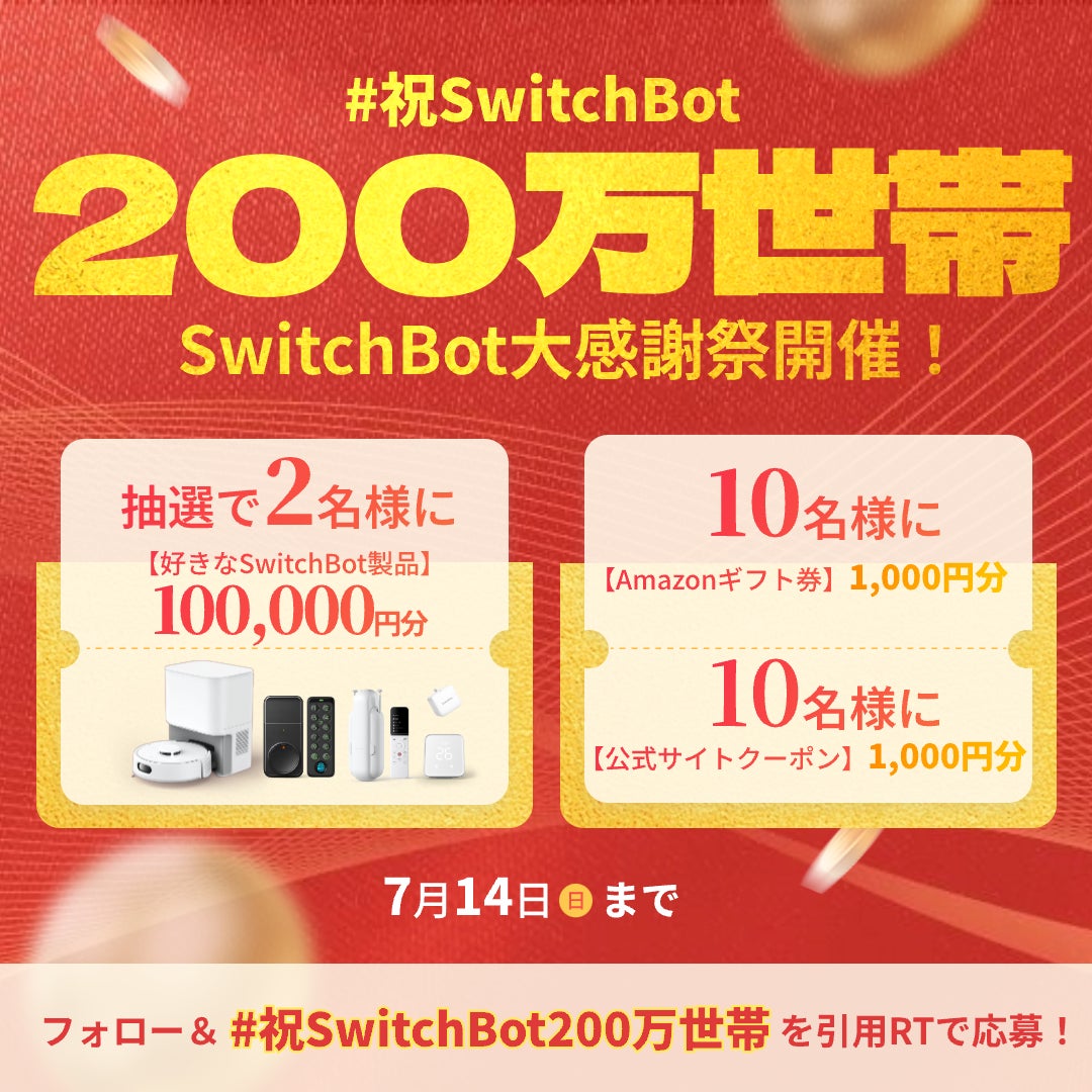 IoT・スマートホーム事業を手掛ける「IoTデバイスNo.1ブランド」(※2022年11月 家電Biz調べ)SWITCHBOT株式会社(本社 : 東京都渋谷区)は、このたび利用者総数が200万世帯を突破。ユーザーの皆さまへ感謝の気持ちを込めて、7月5日(金)~7月25日(木)の期間中、SwitchBot大感謝祭イベントを実施いたします。同イベントでは、公式サイトの感謝祭をはじめ、Amazonプライムデー、楽天感謝祭など、各販路※にてお得な割引キャンペーンを実施。また、SNSの豪華プレゼントが当たる抽選キャンペーンもぜひお見逃しなく。