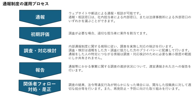 当社では、従来より内部通報制度(以下「本制度」)を設け、当社の業務において法令違反やハラスメントを含む人権侵害等が発生している、または発生のおそれがある場合に通報できる体制を整えていましたが、このたび、本制度を以下のように拡充します。
