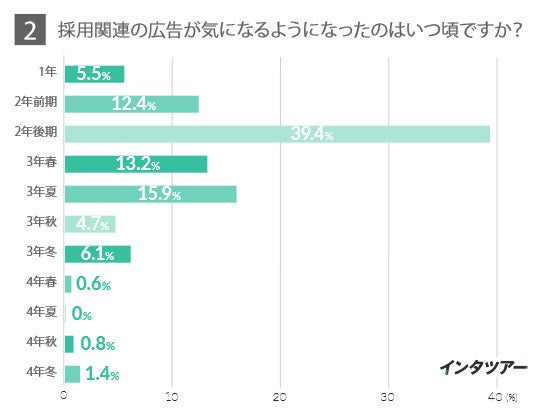 また、設問2では新卒採用関連の広告が気になるようになった時期を聞きました。最多の回答は「2年後期」39.4%で、「3年夏」15.9%、「3年春」13.2% 「2年前期」12.4%が続きました。3年夏までに広告を意識する学生は73.2%に上ります。現在の就活スケジュールは早期化が強まっており、2年生から就活をスタートする学生も増えています。この設問の回答も、学生の意識の変化が反映されたものと考えられます。
