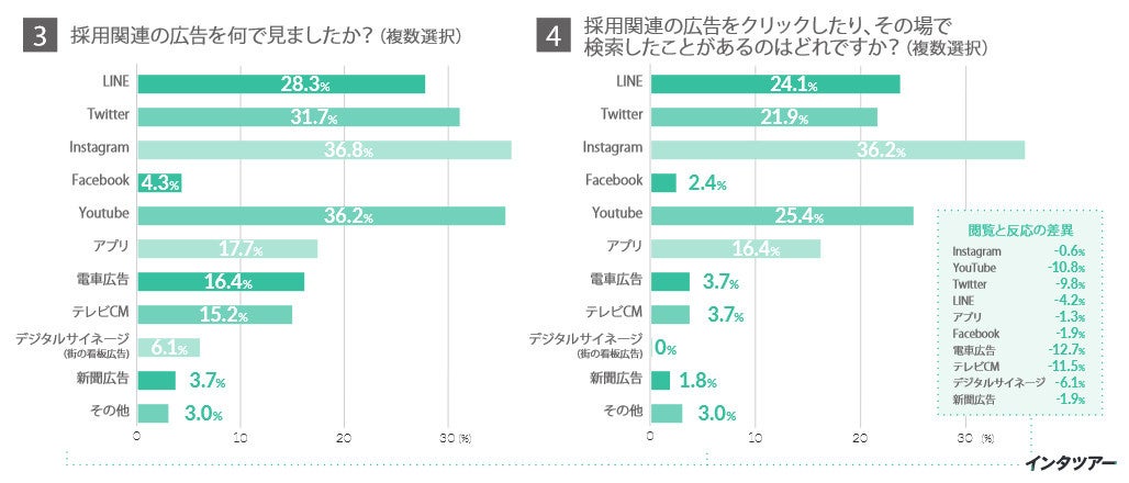 採用広告を見た/クリック・検索ともに Instagram がトップ YouTube、Twitter、LINEが続く