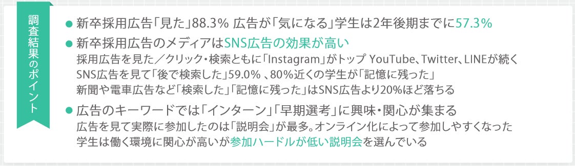 調査結果では、新卒採用広告「見た」学生が88.3%「気になる」学生が57.3%となったほか、SNS広告の効果が高く、「インターン」「早期選考」に興味関心が高いことなどがわかりました。