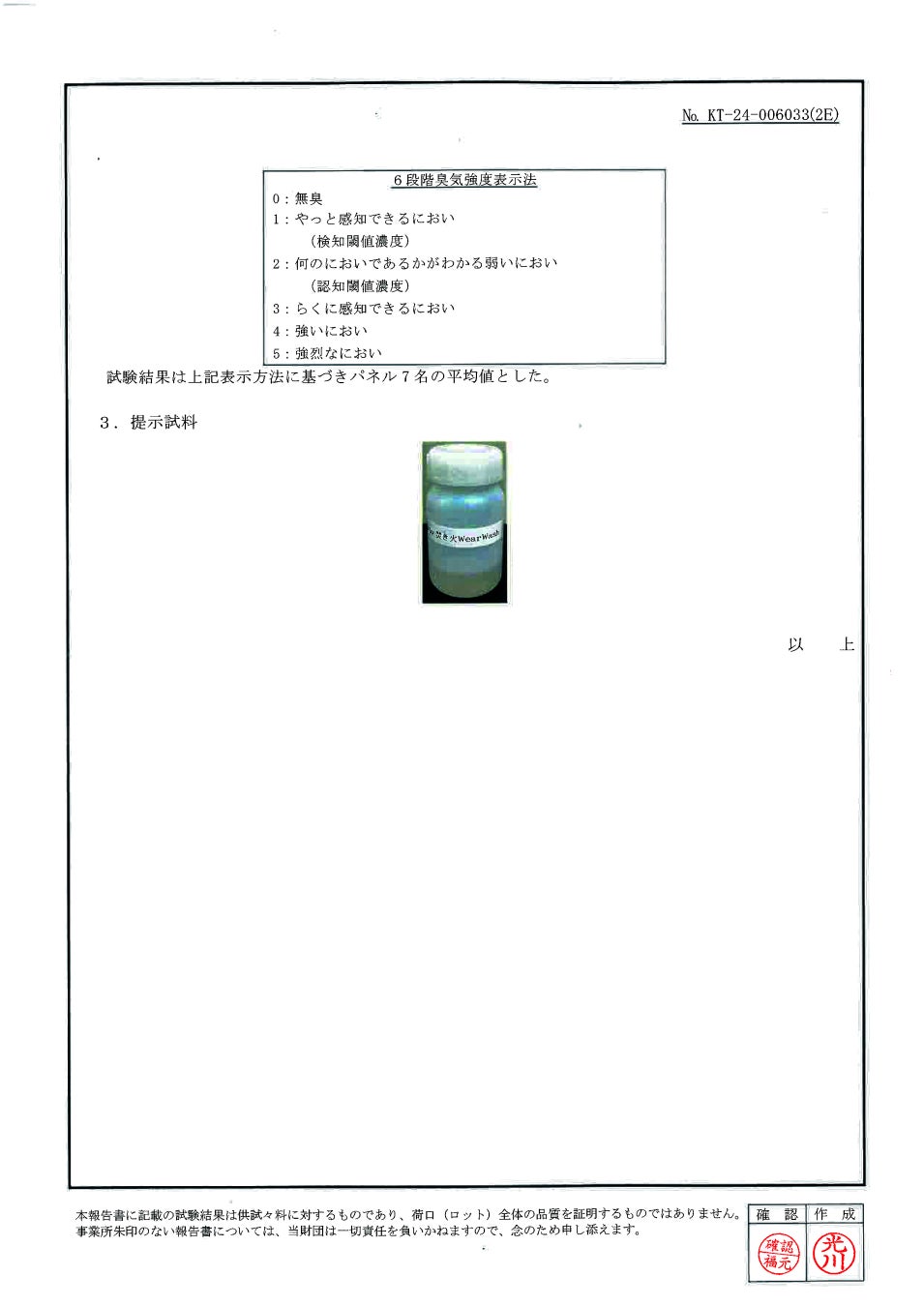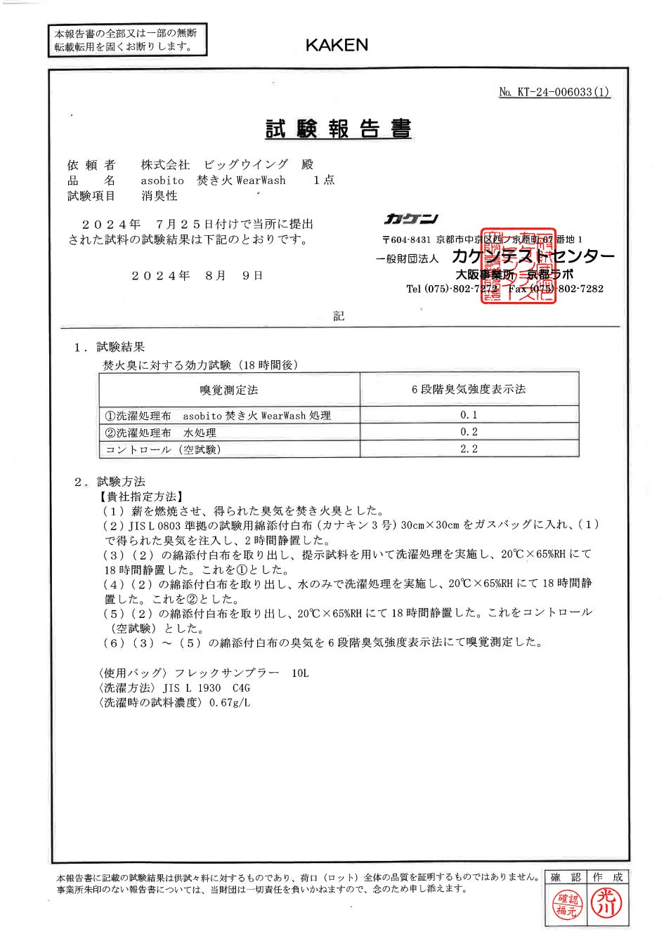 焚き火の匂いの主たる成分を特定し、消臭する成分を独自に配合して一般的な衣料用洗剤よりも焚き火の匂いに対して消臭効果が優れていると第三者機関に認められました。