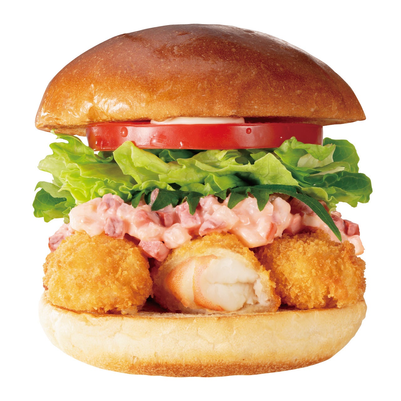 海老フライは衣にザクザクとした食感を感じられるクラッカーパン粉を使用し、打ち粉に醤油を加えることでそのままでもおいしいと感じられる風味になっています。刻みカリカリ梅のタルタルソースにフレッシュ野菜のレタス・トマト・大葉とマヨネーズで仕立てたしっかり食べ応えがありながらもさっぱり感の楽しめる“和バーガー”です。