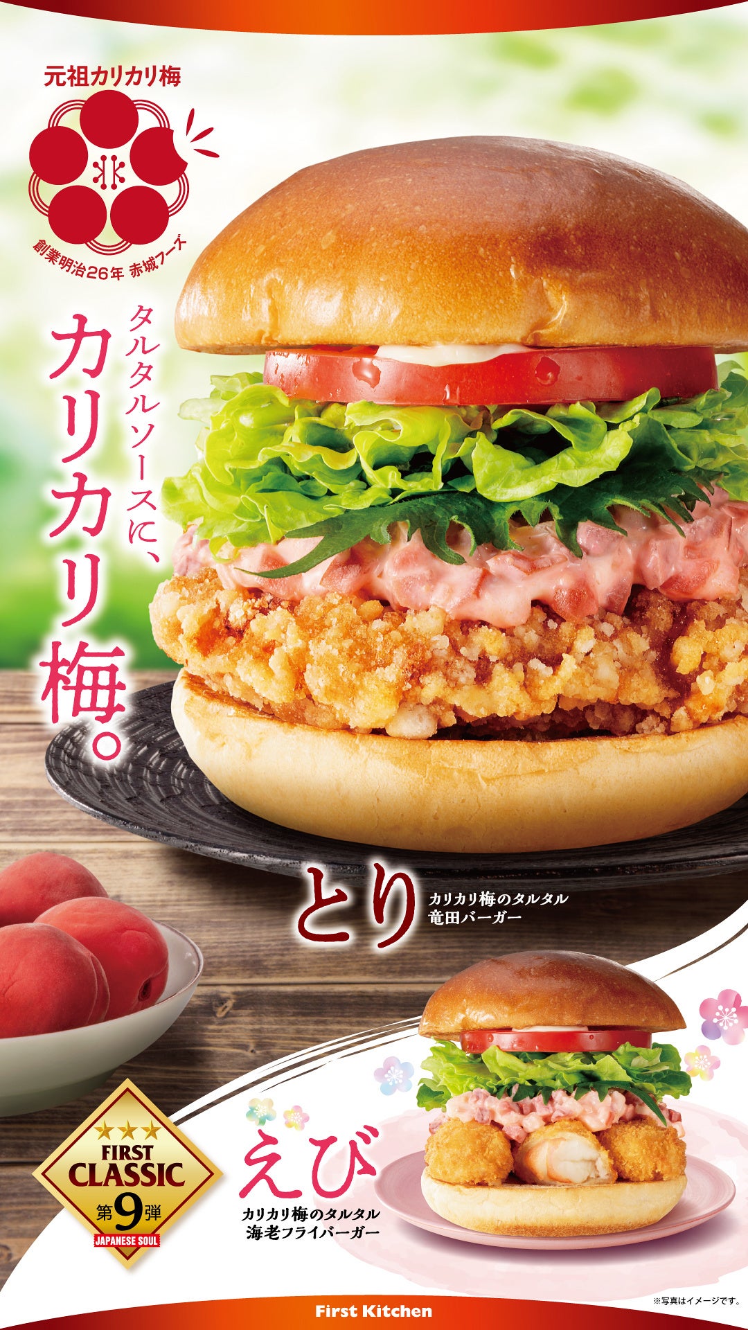 さっぱりと和風な仕立てで、春らしい色合いの「刻みカリカリ梅」と、創業以来“旨味”を追求し続けているファーストキッチンオリジナルの具だくさんタルタルソースを混ぜ合わせた、塩味と甘味のバランスが絶妙でカリカリ食感が楽しめる商品です。フレッシュ野菜のレタス・トマト・大葉とマヨネーズで仕立てた、まるごと“和バーガー”の誕生です。