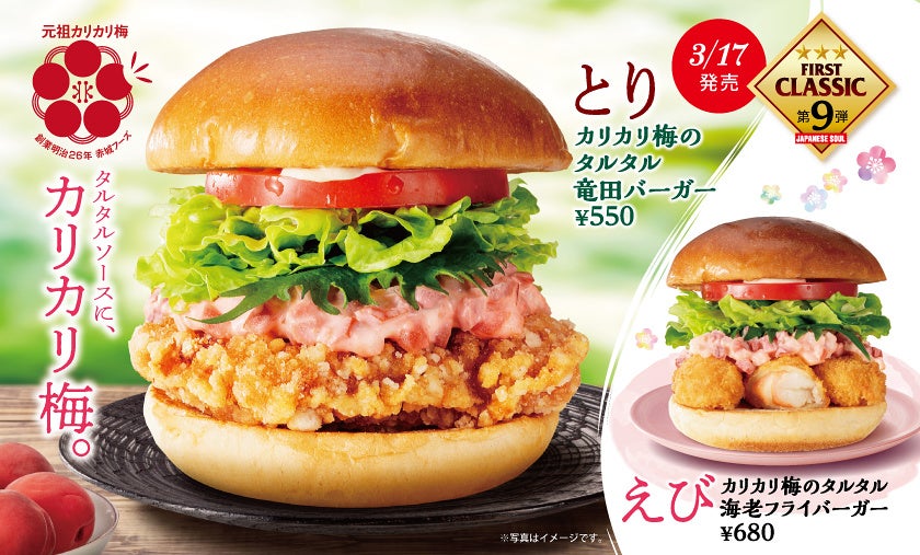 3月17日(木)より、店頭で『カリカリ梅のタルタル竜田バーガー』 または 『カリカリ梅のタルタル海老フライバーガー』 のフレーバーポテトM・ドリンクセットをご注文いただくと、先着36名様 に 「懐かしのカリカリ梅」1粒をプレゼントいたします!発売から50年たった今でも変わらない、カリカリ感を大切にした懐かしの味を、ぜひご賞味ください。