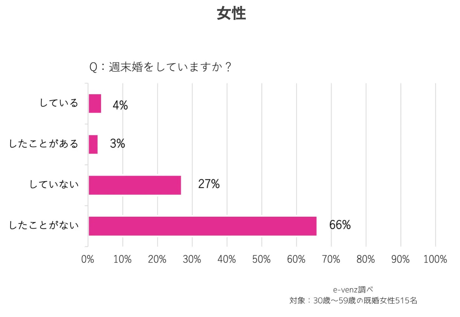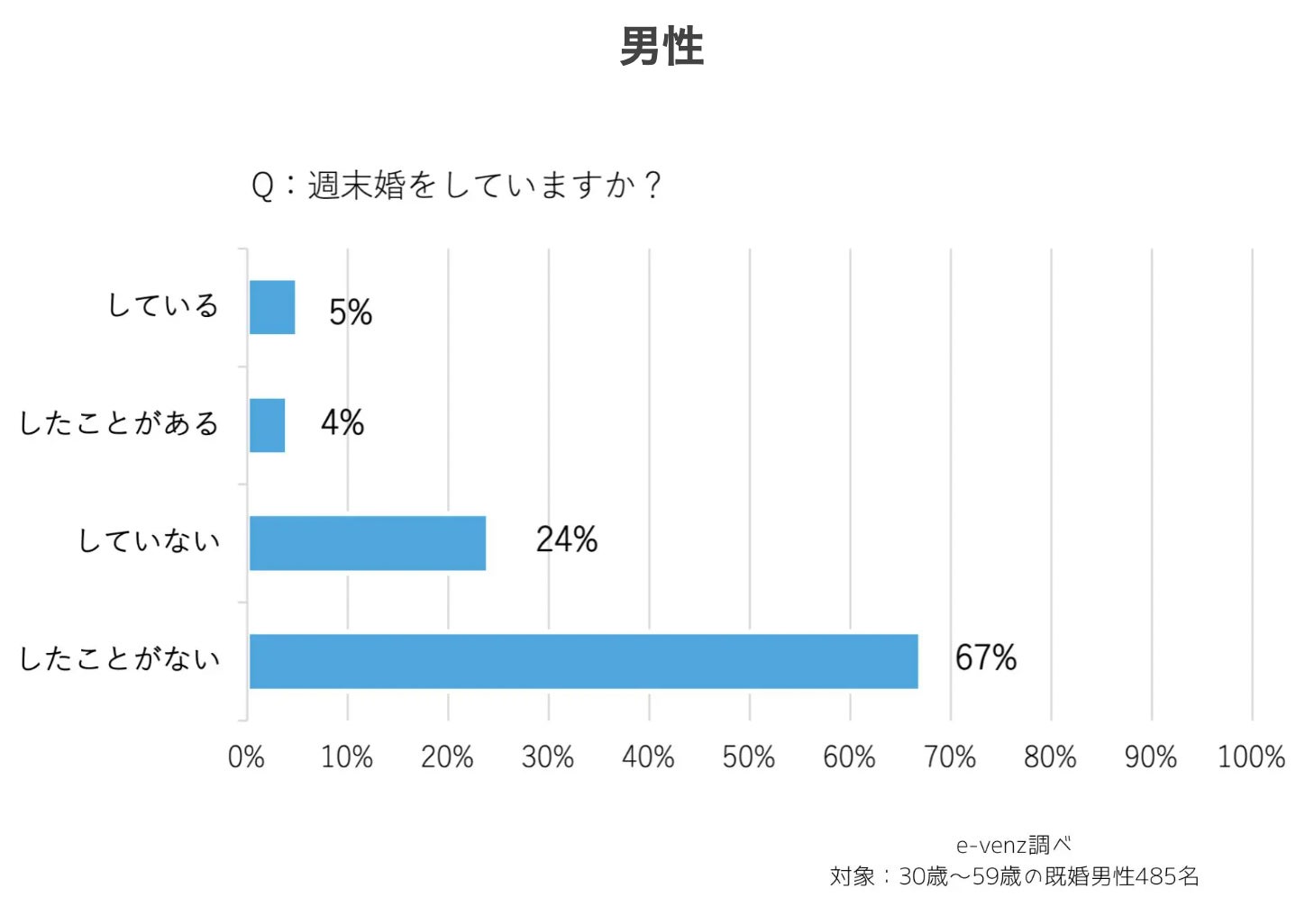 調査の結果、男女共に3~5%の方が「している」「したことがある」と回答しています。週末婚の経験者は少数のようです。