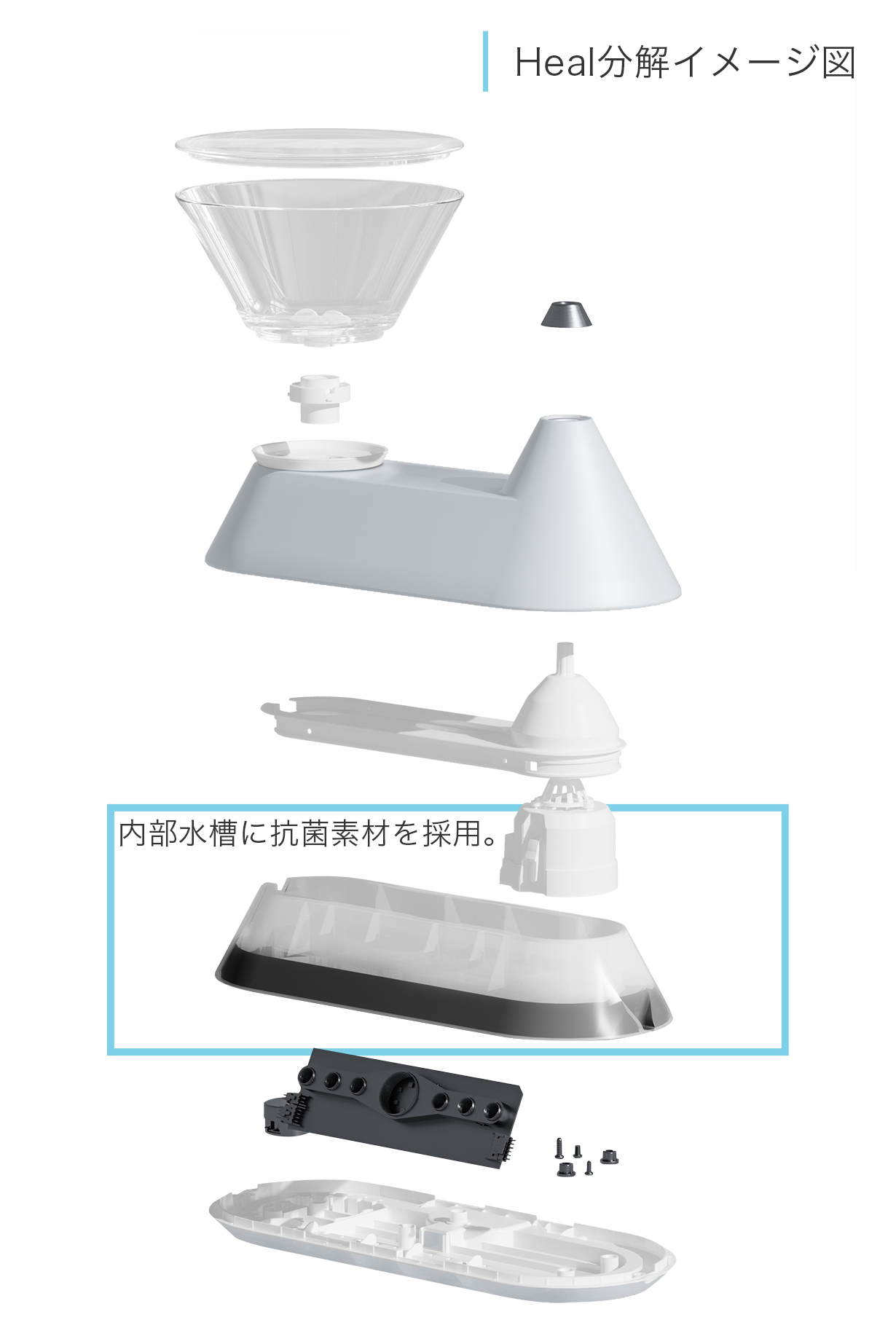 従来の加湿器と一線を画す 本モデルのユニークな形状は、現代の多様なインテリアに馴染むよう、カラーリング、表面の質感に至るまで何度も検討と試作を繰り返して今のデザインへ辿り着きました。デザイナー達のユーモア溢れるコンセプトデザインを元に新しい加湿器のスタイル 美しく佇む加湿器「Heal」を造り上げました。