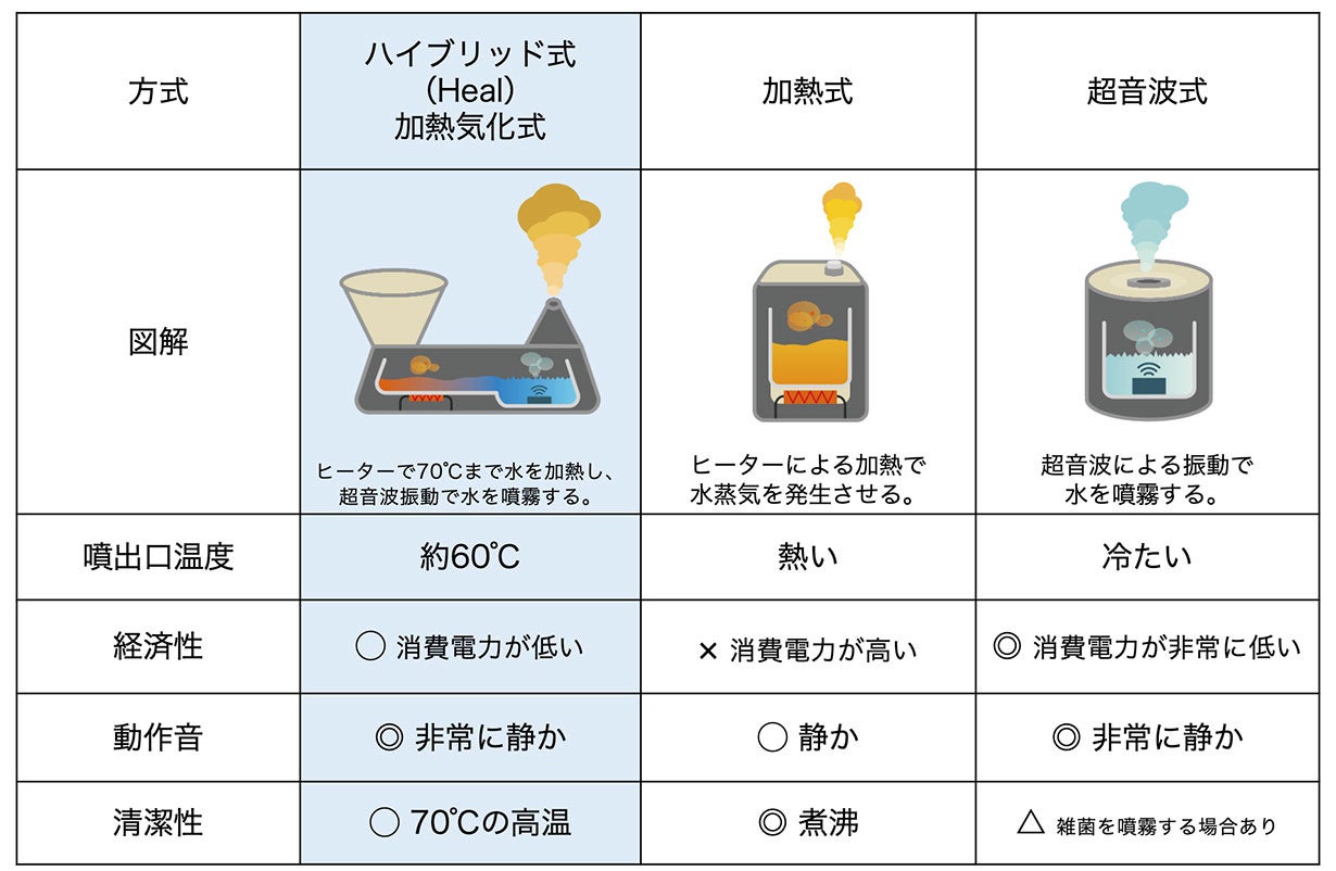 - 消費電力を抑え、加湿効率も高めるために超音波式+加熱式のハイブリッド式を採用。