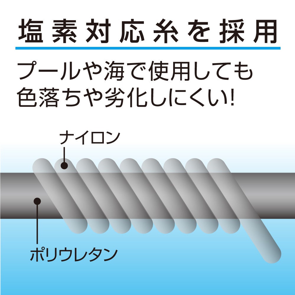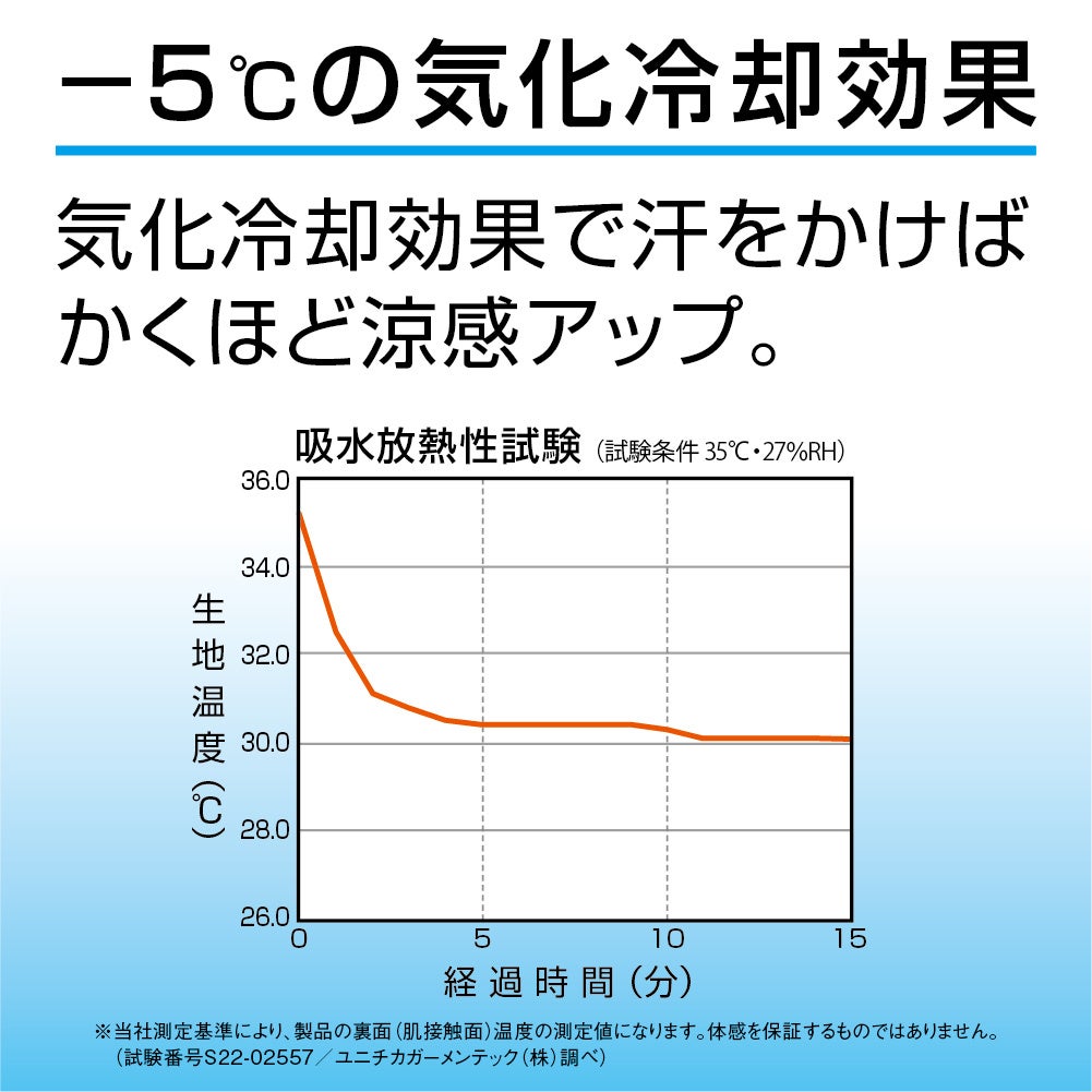 抗菌・防臭加工。-5℃の気化冷却効果で汗をかけばかくど涼感アップ。塩素対応糸を採用しているためプールや海で使用しても色落ちや劣化しにくく、水陸両用でお使いいただけます。近赤外線70%カット。