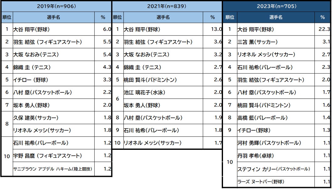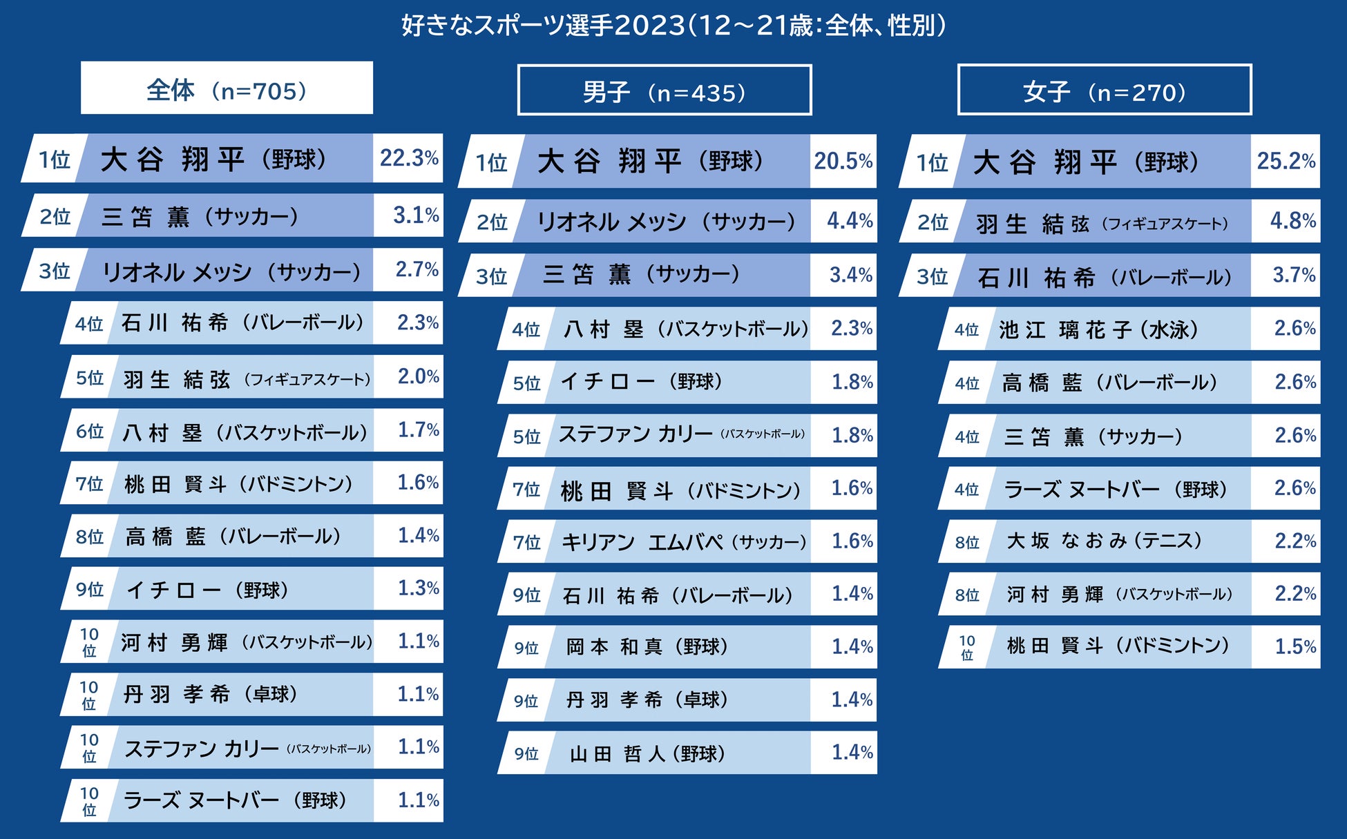 最新の調査は2023年6~7月に実施。青少年(12~21歳)の「好きなスポーツ選手」調査で272名の名前があげられたなか、1位・大谷翔平、2位・三笘薫、3位・リオネル メッシとなりました(速報版・2023年10月2日に案内済)。