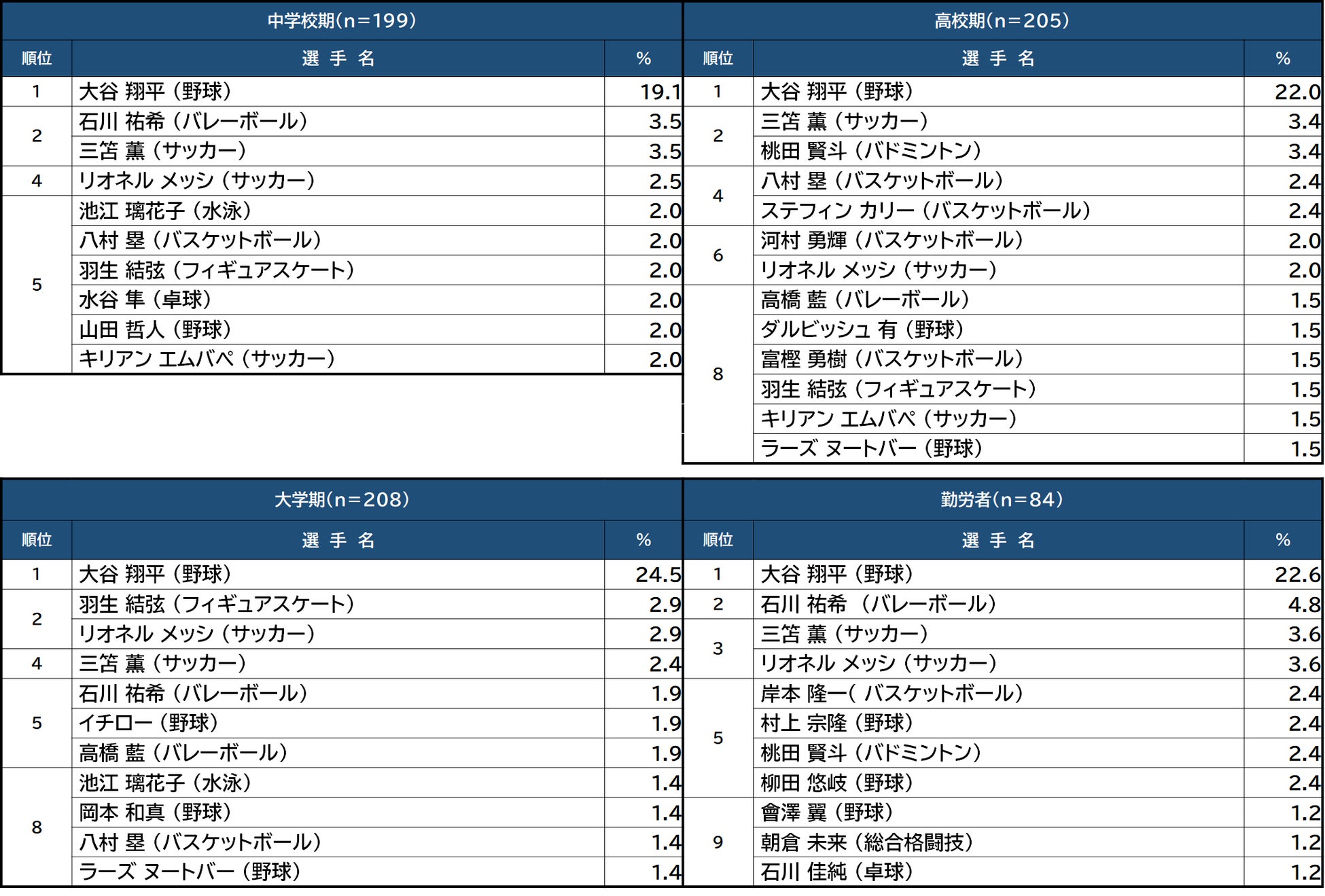 学校期別にみると「大谷翔平」が中学校期19.1%、高校期22.0%、大学期24.5%、勤労者22.6%といずれの学校期においても1位であり、高い人気を示した(図表3)。中学校期では「石川祐希」と「三笘薫」(3.5%)、高校期では「三笘薫」「桃田賢斗」(3.4%)、大学期では「羽生結弦」「リオネルメッシ」(2.9%)、勤労者では「石川祐希」(4.8%)が2位で続いた。