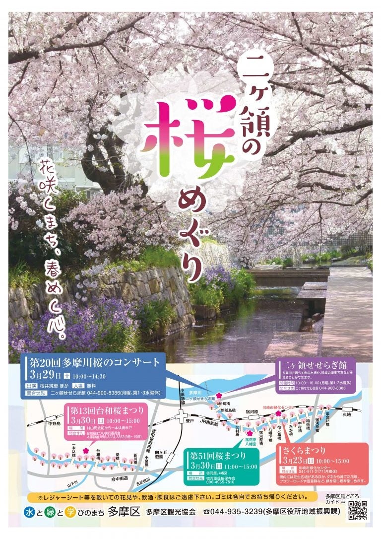 多摩区の桜の名所として名高い二ヶ領用水では、「桜めぐり」と題し、今年も数々のイベントが予定されています。