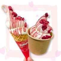 当店人気のなめらか濃厚なバニラソフトクリームに、苺味のパリパリチョコ、ラズベリーと桜を合わせたソフトクリームです。