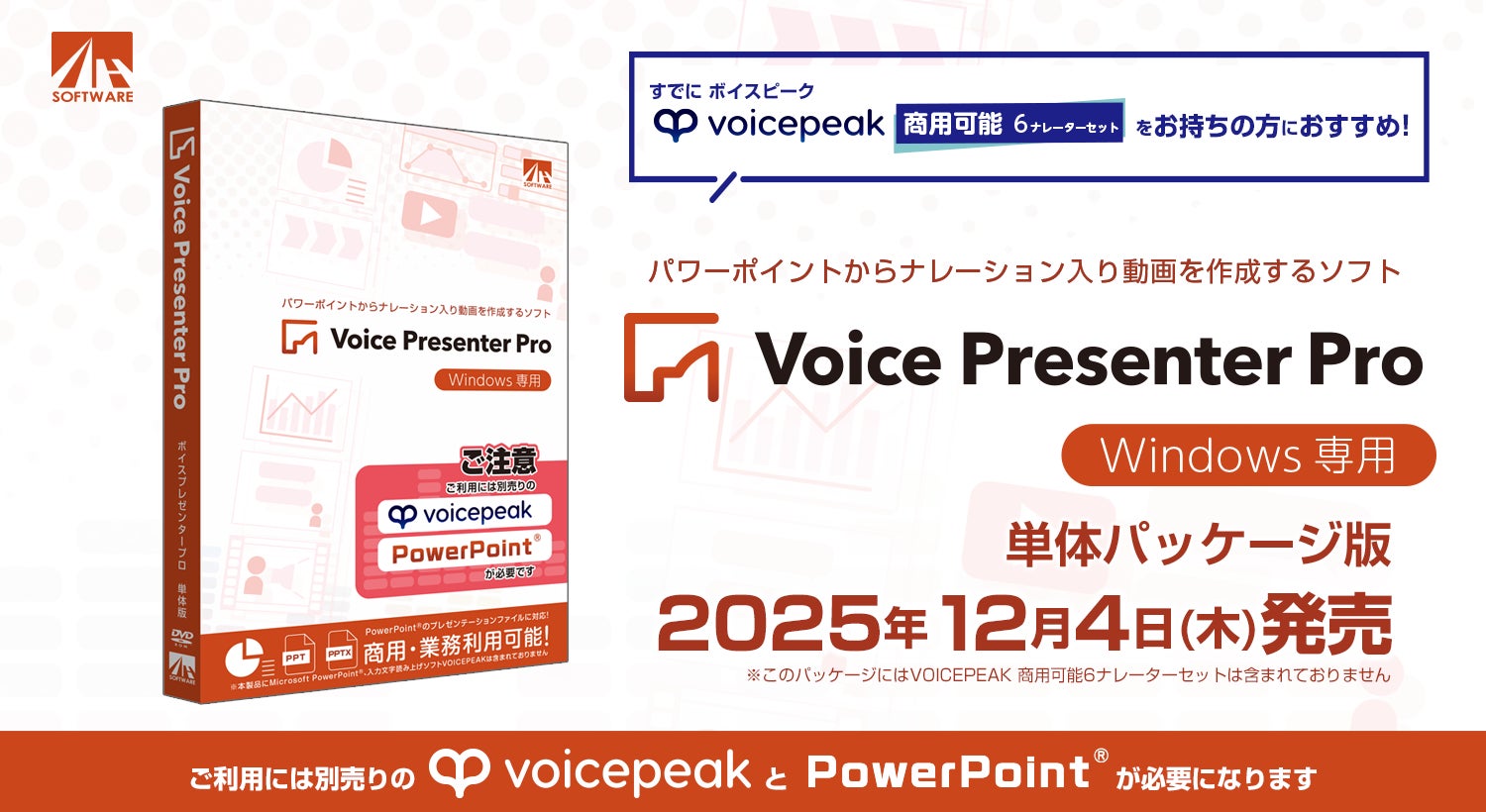 株式会社AHS(東京都台東区、代表取締役 兼 CTO:フア カンル)は、大好評の入力文字読み上げソフト「VOICEPEAK 商用可能 6ナレーターセット」とパワーポイントと組み合わせることでナレーション入り動画が作成できるソフト「Voice Presenter Pro」単体パッケージ版を本日12月4日にAHSストアにて発売することを発表いたします。