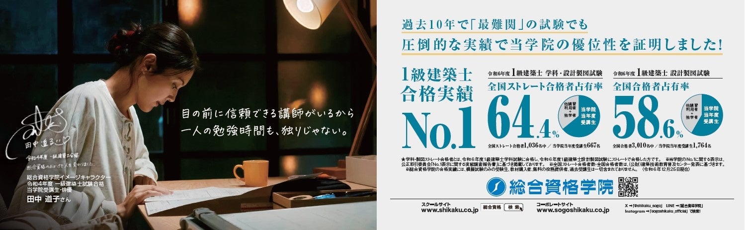 建設・不動産関連の資格取得スクール「総合資格学院」を運営する株式会社総合資格(本社:東京都新宿区、代表取締役:岸 和子)は、12月25日(水)、公益財団法人 建築技術教育普及センターの「令和6年度 一級建築士設計製図試験」の発表をうけ、当学院当年度受講生の合格者数が1,764名、全国合格者占有率58.6%と、日本一の合格実績を達成しました(同日現在)。また、本設計製図試験について学院として分析を行いましたので、あわせて報告いたします。