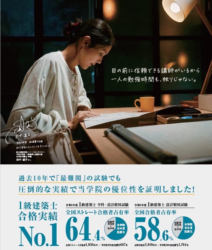 令和6年度1級建築士試験において、学科試験と設計製図試験を1年で突破したストレート合格者(注1)の6割以上(注2)を、また、設計製図試験の合格者のおよそ6割(注3)を当学院当年度受講生が占め、「日本一」の合格実績を達成しています。
