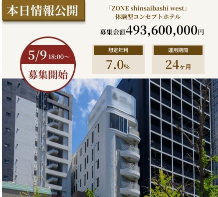 この度新たに42号ファンド「ZONE shinsaibashi west」の情報を2023年4月28日より公開し、2023年5月9日18時より募集を開始致します。
