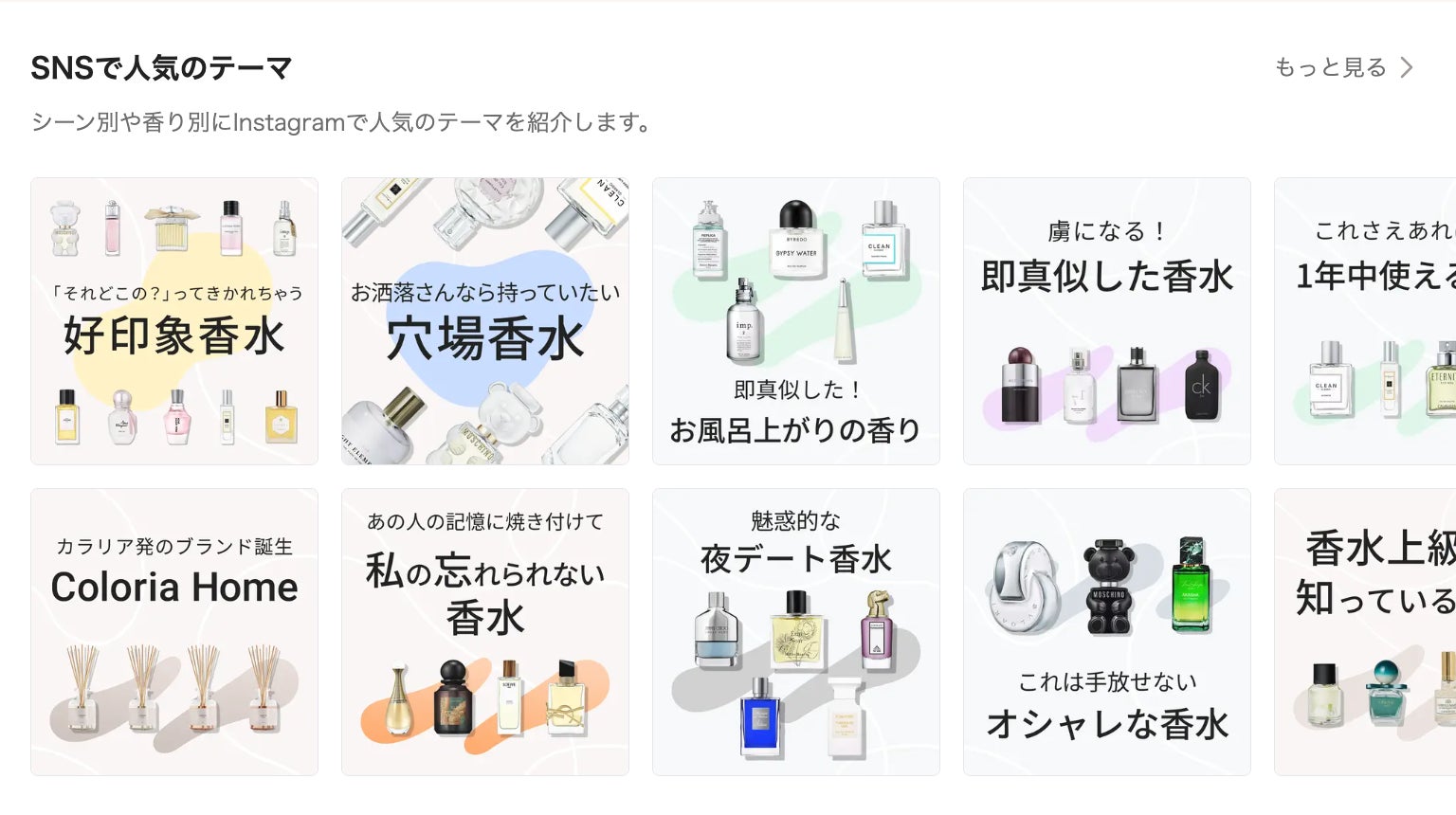 香り軸だけでなく、シーンやイメージなど様々な切り口から香水を選べるように、テーマごとにグループ化された記事コンテンツ